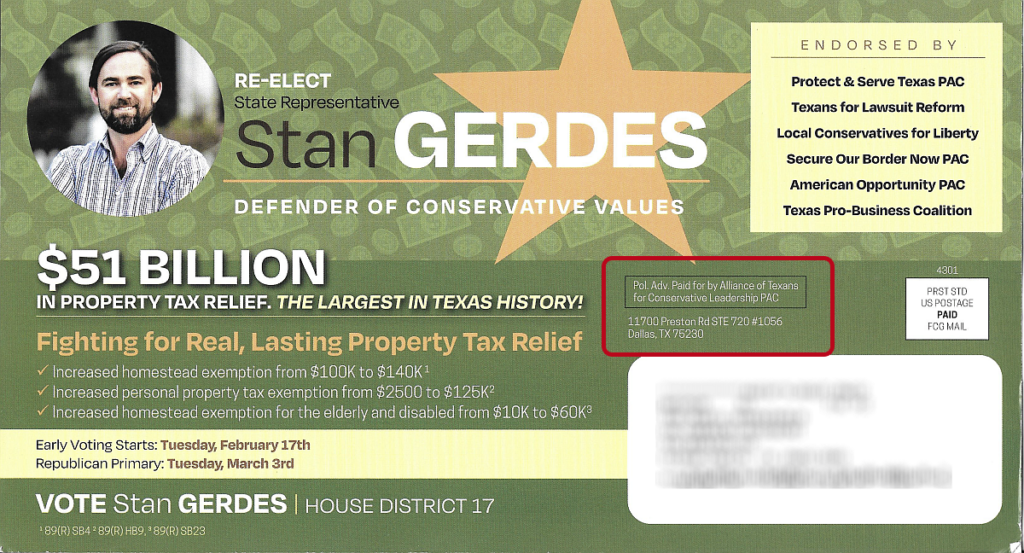 UPDATE: Today four Stan Gerdes flyers arrived, all from Political Action Committees OUTSIDE Texas. Ask yourself why Alexandria VA PACs want Stan Gerdes in the Texas House so badly that they’ll do 4 mailings in one day? Two of the four have the same treasurer. Hmmmm…….